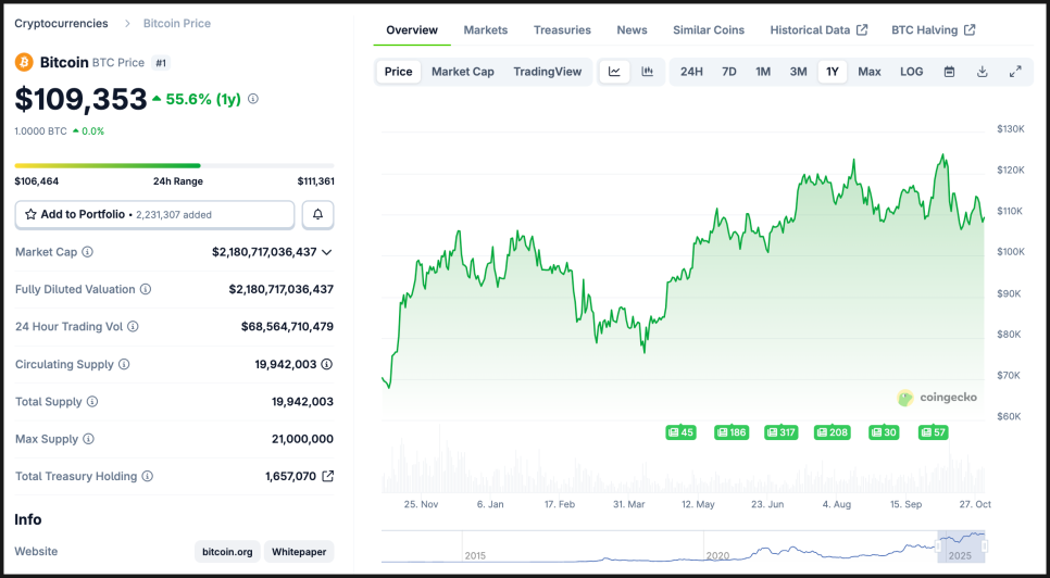 10월 31일 기준으로 비트코인 가격은 약 10만 9천 달러까지 내려앉았습니다. 단 하루 만에 5% 가까이 하락한 건데요. 미국 내 현물 비트코인 ETF 자금 유입이 식어가고, 제롬 파월 연준 의장의 ‘매파적(hawkish)’ 발언이 위험자산 전반을 흔들었기 때문입니다.
