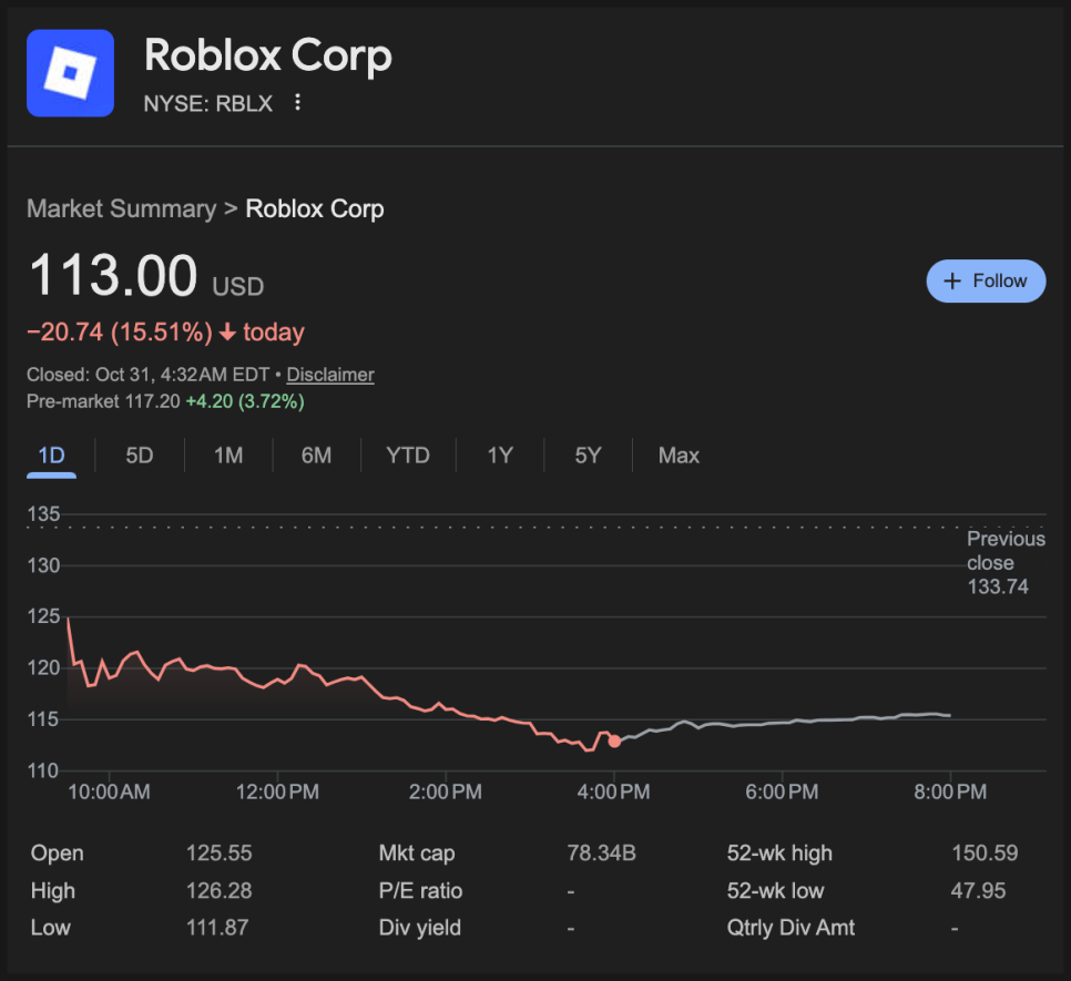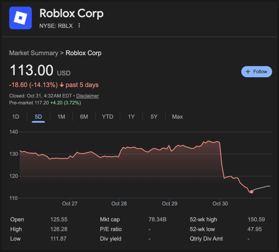 그런데도 시장의 반응은 냉정했습니다. 실적 발표 직후 로블록스의 주가는 13% 이상 급락했는데요. 이유는 숫자보다 “전망”에 있었습니다. 회사가 2026년에는 영업이익률이 하락할 수 있다고 경고했기 때문입니다.