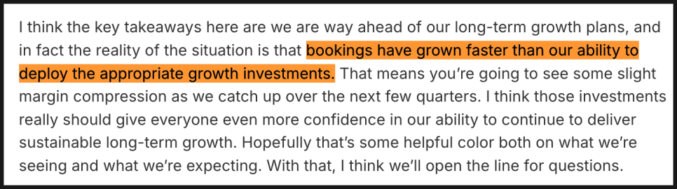 CFO인 나빈 초프라(Naveen Chopra)는 더 구체적인 재무 관점을 제시했습니다. 그는 “예약 매출이 너무 빠르게 성장해서, 회사의 투자 속도가 오히려 따라잡지 못하고 있다”고 말했습니다. 즉, 성장 속도가 워낙 빨라서 인프라 투자가 늦어진 것이라는 설명이었죠.