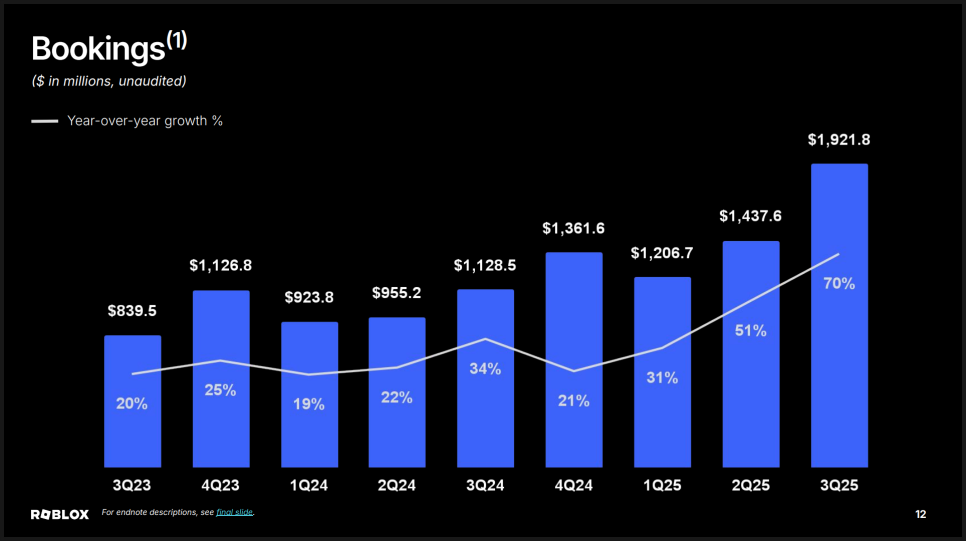 이번 분기 로블록스는 예약 매출(Bookings) 19억 2천만 달러, 전년 대비 70% 증가라는 놀라운 결과를 발표했습니다. 예약 매출이란 이용자들이 구매한 가상화폐의 총액으로, 실제 매출로 잡히기 전 단계의 지표입니다.