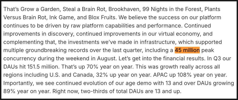 답은 규모의 비용(scale cost)에 있습니다. 로블록스의 서버는 동시에 4,500만 명 이상의 이용자를 감당해야 합니다. 실제로 지난 8월 한 주말에는 이 숫자가 사상 최고치를 기록했죠.