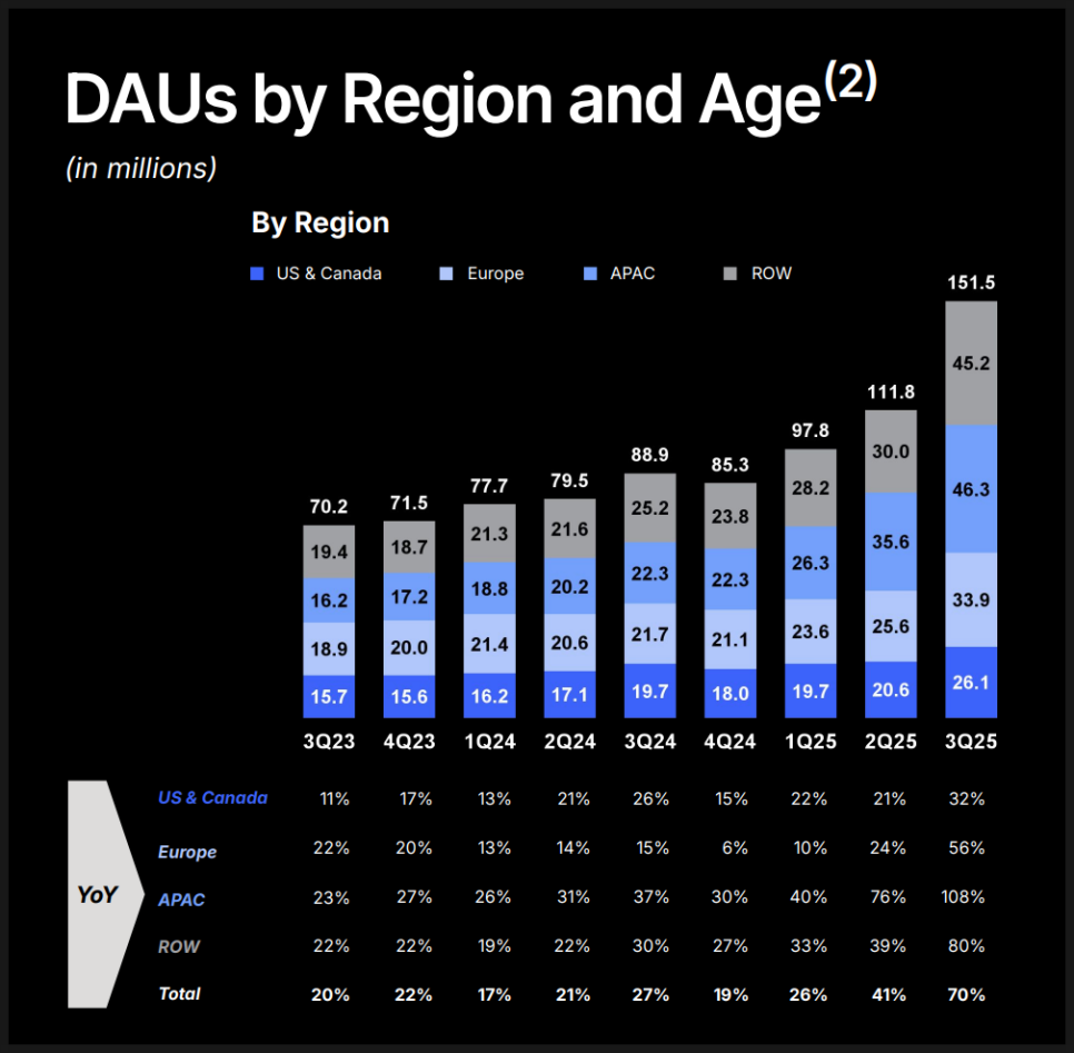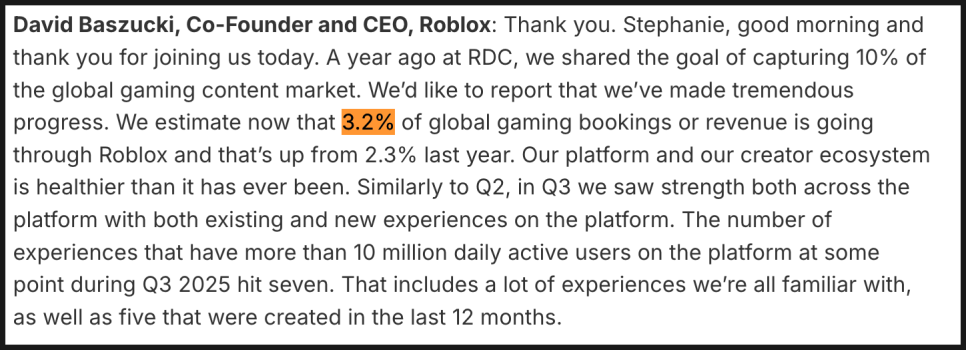 이 같은 성장은 로블록스가 단순히 서구권 중심의 플랫폼을 넘어 글로벌 엔터테인먼트 인프라로 확장하고 있음을 보여줍니다. 회사는 현재 전 세계 게임 시장 매출의 3.2%가 로블록스를 통해 발생한다고 추정하고 있는데요, 불과 1년 전 2.3%였던 점을 감안하면 놀라운 확장 속도입니다.