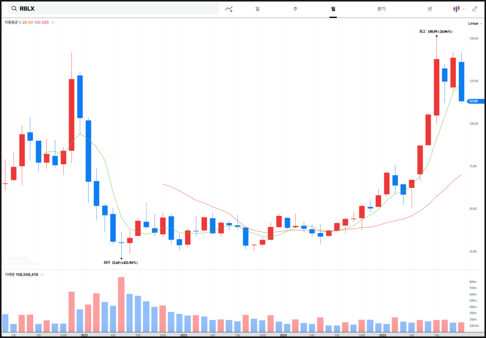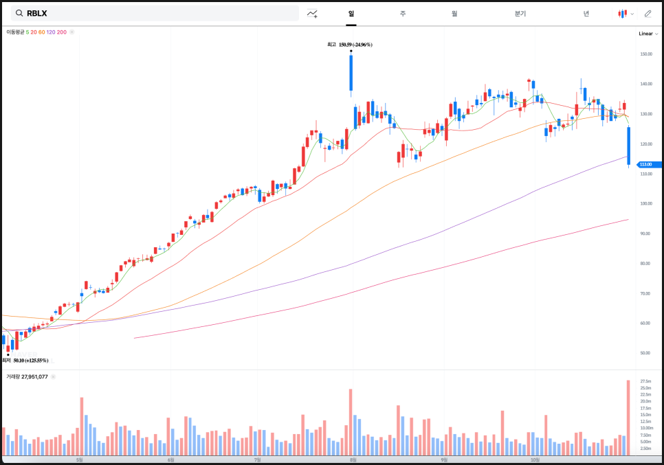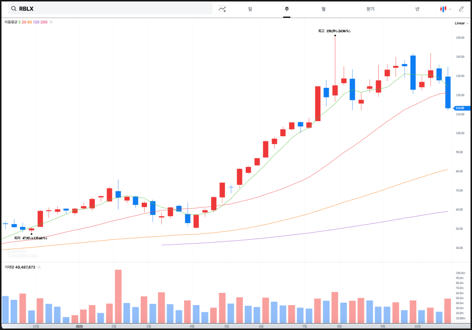 로블록스 주봉 차트를 보면, 단기 상승 랠리 이후 조정이 본격화된 모습이 확연하게 드러납니다. 5월 초 약 48달러 수준에서 시작된 상승 흐름은 7월까지 이어지며 150달러 부근까지 거의 세 배 가까이 올랐습니다. 하지만 이후 매수세가 둔화되고, 최근 몇 주간은 강한 조정 캔들이 나타나면서 단기 상승세가 꺾였습니다.