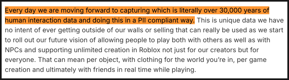 바주키 CEO는 로블록스가 매일 처리하는 데이터를 “하루에 3만 년 분량의 인간 상호작용 데이터”라고 표현했습니다. 이 데이터는 외부에 판매되지 않고, 오직 플랫폼 내 AI 학습에만 사용된다고 강조했죠.