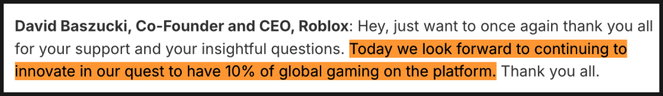 바주키 CEO는 이번 실적 발표에서 “전 세계 게임 콘텐츠 시장의 10%를 로블록스를 통해 만들겠다는 목표는 변함없다”고 밝혔습니다. 그는 “플랫폼과 크리에이터 생태계가 그 어느 때보다 건강하다”고 강조하며, 신규 게임 7개가 일간 1천만 명 이상의 이용자를 기록했다고 밝혔습니다.
