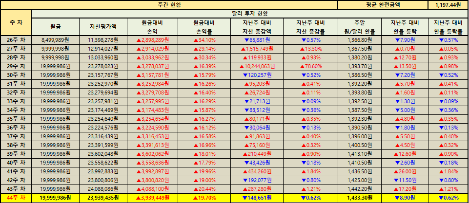 하락장에서도 지켜야 할 것은 ‘흐름의 방향성’이라 생각합니다. 수익률보다 구조와 비중을 관리하는 것이 중요하다고 보고 있으며 이번 주 역시 그 원칙이 잘 작동한 한 주였습니다.