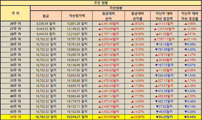 | 자산 증감(률) | -84.29달러 / -0.44% |