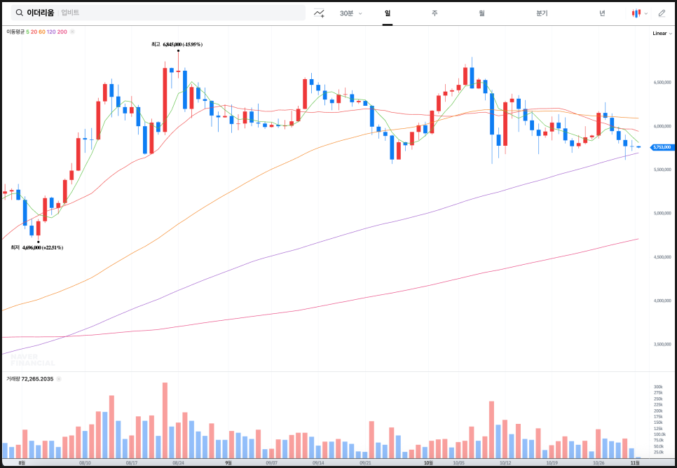 하지만 10월 중순 이후 현재 단기 이동평균선(5일선, 20일선)이 하락세로 전환됐고, 캔들의 고점도 점차 낮아지고 있습니다. 다만 장기 이동평균선(120일선, 200일선)은 아직 우상향 기조를 유지하고 있어, 중장기 추세 자체가 꺾인 것은 아닙니다.