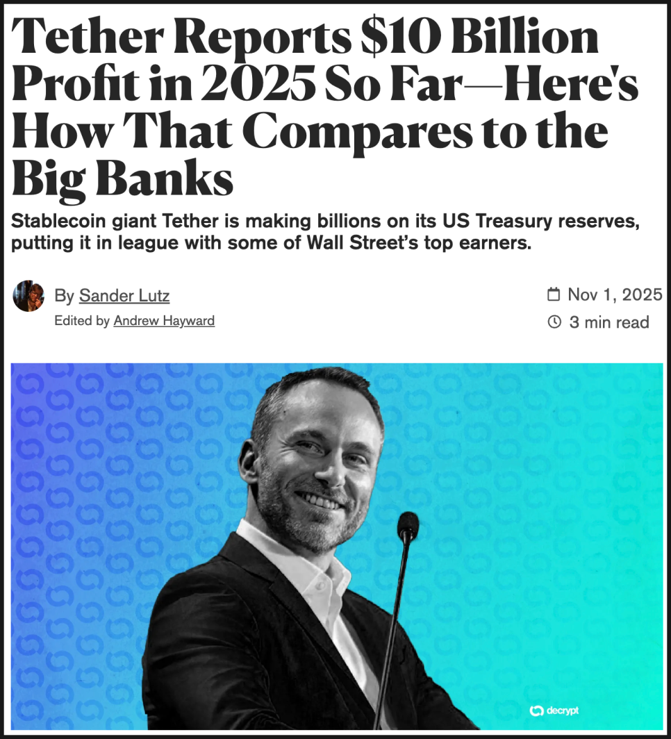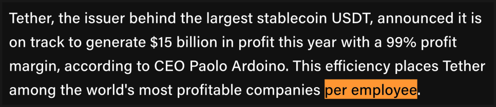 이 때문에 테더는 직원 1인당 이익 기준으로 세계 최고 수준의 기업으로 꼽힙니다. 애플이나 마이크로소프트보다 더 높은 효율을 낸다고 해도 과하지 않습니다. 다만 이런 구조는 ‘이익의 공정성’ 문제도 제기합니다. 사용자들이 맡긴 자금에서 생긴 이자를 회사가 모두 가져가기 때문이죠. 테더가 거대한 수익을 내는 동안, 실제로 USDT를 쓰는 사람들은 아무런 수익을 얻지 못합니다.