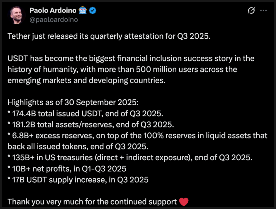 세계 최대 스테이블코인 발행사인 테더(Tether)가 2025년 1~3분기 동안 무려 100억 달러의 순이익을 기록했습니다. 최고경영자 파올로 아르도이노(Paolo Ardoino)는 연말까지 150억 달러 수익 달성이 가능하다고 밝혔죠.