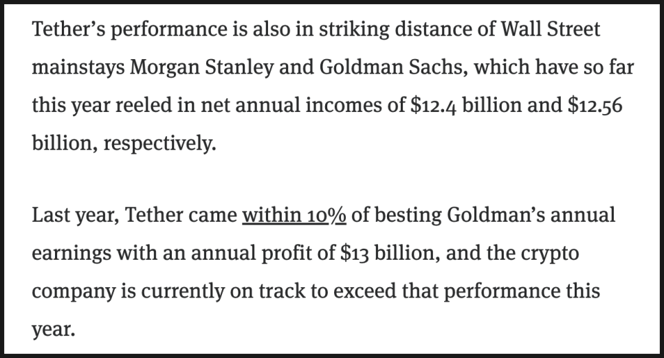 테더의 실적 규모는 미국의 주요 은행들과 비교해도 놀라운 수준입니다. 같은 기간 뱅크오브아메리카(Bank of America)의 이익 89억 달러를 넘어섰고, U.S. 뱅크(U.S. Bank)의 55억 달러보다 두 배 가까이 많습니다. 골드만삭스(Goldman Sachs)와 모건스탠리(Morgan Stanley)가 각각 125억 달러 안팎의 수익을 거둔 것을 감안하면, 테더는 이제 월가의 ‘톱 티어’와 어깨를 나란히 하는 셈입니다.