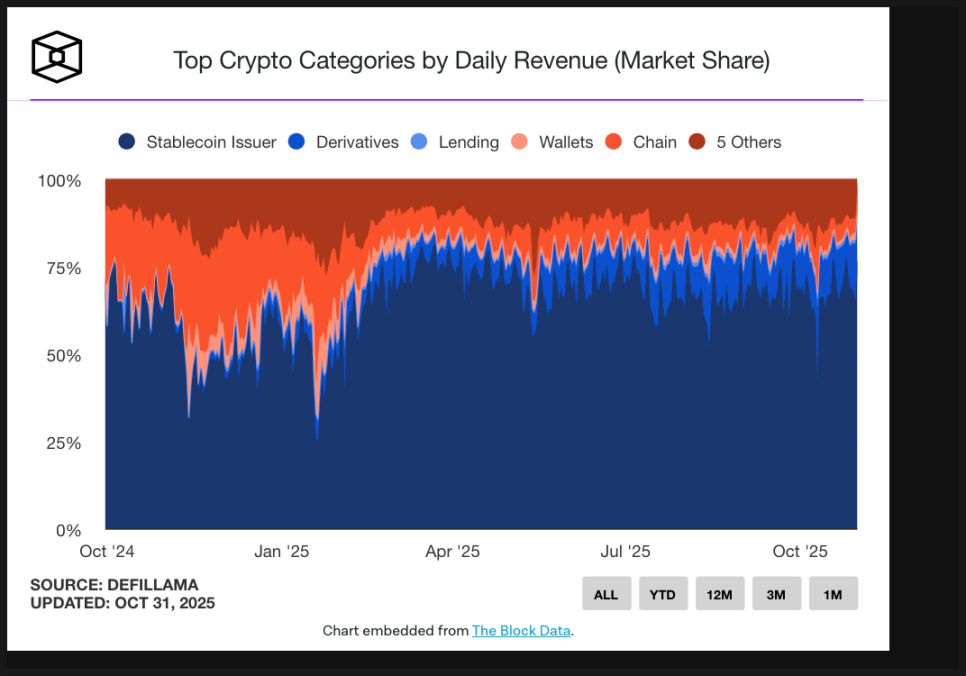 현재 스테이블코인 발행사들이 전체 암호화폐 산업 수익의 60~75%를 차지하고 있습니다. 탈중앙화 금융(DeFi), 대출, 거래소, 블록체인 인프라 등 거의 모든 분야의 자금 흐름이 스테이블코인을 중심으로 돌아갑니다.