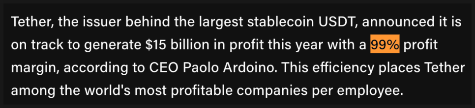 즉, 준비금에서 발생하는 이자 수익이 고스란히 순이익으로 남는 구조입니다. 금리가 연 4~5%만 되어도 이자 수익은 수십억 달러에 달하죠. 게다가 테더는 인력이나 설비, 규제 비용이 거의 없어 이익률이 무려 99%에 달합니다. 사실상 ‘세계에서 가장 효율적인 금융회사’라고 해도 과언이 아닙니다.