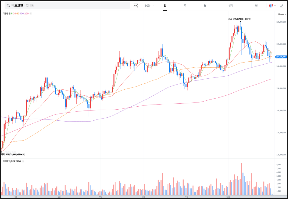 8월 말에는 1억 4900만 원 부근에서 저점을 찍은 뒤 반등에 성공하며 상승 전환이 시작됐습니다. 9월 중순까지 완만한 상승 흐름이 이어졌고, 10월 초에는 거래량이 크게 증가하면서 급등세가 나타났습니다. 이때 최고가는 약 1억 7980만 원으로, 이전 저점 대비 약 20% 이상 상승한 구간입니다.