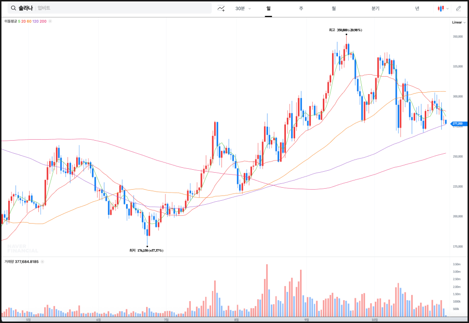 솔라나 일봉 차트입니다. 역시나 최근 캔들 흐름을 보면 단기 이동평균선(5일선, 20일선)이 하락세로 전환됐고, 캔들 위치도 장기선(120일선, 200일선) 근처까지 내려와 있습니다. 현재 가격은 약 277,000원대로, 120일선 부근에서 지지를 시도하는 모습이 보입니다.