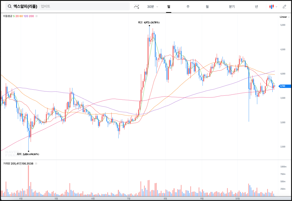 리플(XRP, 엑스알피)의 일봉 이동평균선을 보면 단기선(5일선, 20일선)이 계속 교차하며 방향성을 잃은 상태이고, 중기선(60일선)과 장기선(120일선, 200일선) 근처에서 등락을 반복하고 있습니다. 최근에는 약 3,700원 수준에서 거래 중이며, 200일선 위아래를 오가는 모습이 나타납니다.