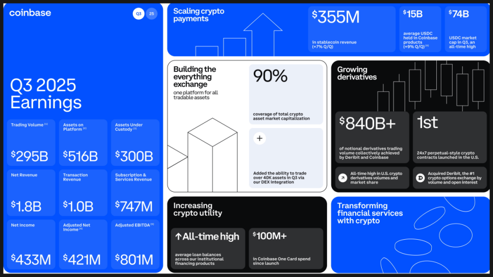 실적 발표에서 브라이언 암스트롱(Brian Armstrong) CEO는 “코인베이스는 ‘The Everything Exchange(모든 것을 거래할 수 있는 거래소)’로 진화 중이며, 암호화폐뿐 아니라 주식·원자재·예측시장까지 포함한 전 자산군 거래 플랫폼으로 확장 중”이라고 밝혔죠.