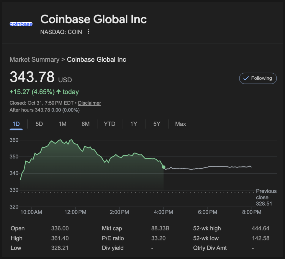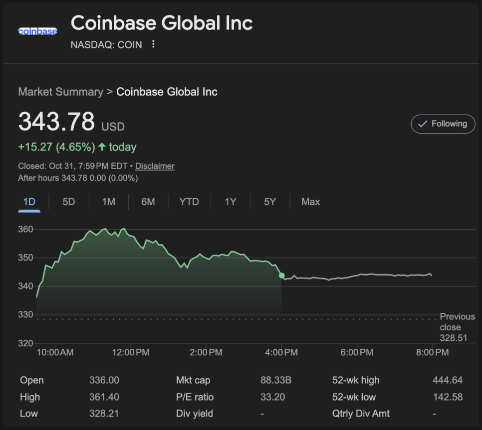 실적 발표 이후 코인베이스의 주가는 실적 발표 후 약 8% 상승하며 361달러까지 올랐으나 4.65% 상승으로 마무리됐습니다.