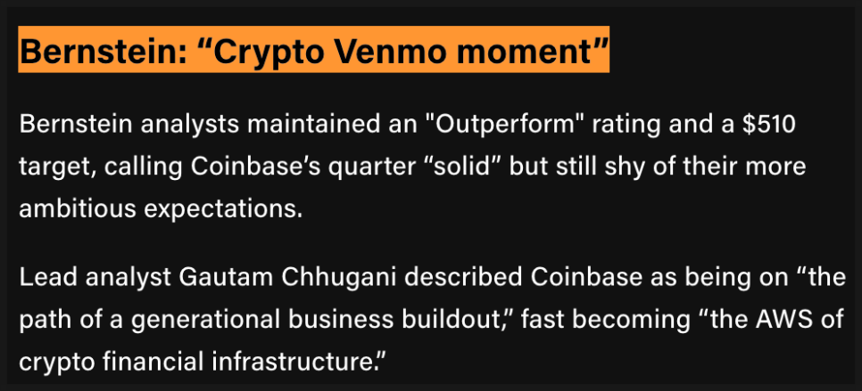 번스타인(Bernstein)은 코인베이스의 베이스 앱이 벤모(국내의 카카오페이 같은 앱)처럼 실생활에 녹아들 것이라고 보고 있는데요. 사용자가 단일 앱 안에서 거래, 결제, 소셜 기능을 모두 사용할 수 있게 되면서 일반 소비자 시장에서도 암호화폐 활용이 자연스럽게 확산될 것이라 전망하고 있습니다.