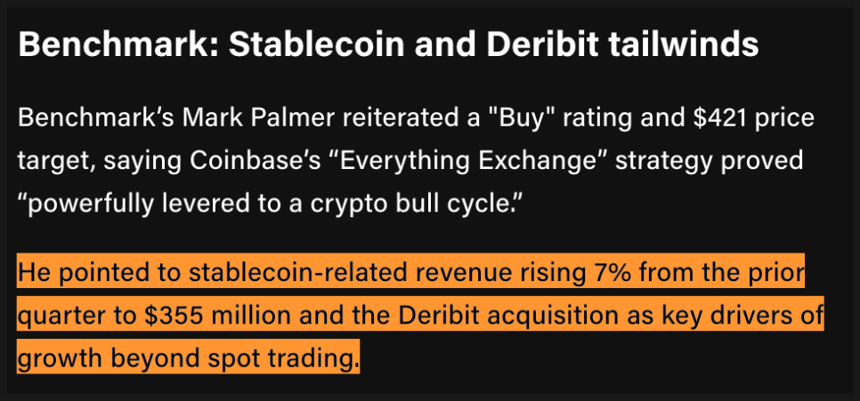 둘째, 스테이블코인 수익입니다. 이번 분기 USDC 관련 매출은 3억 5,500만 달러, 전분기 대비 7% 증가했습니다. 이는 거래량에 상관없이 꾸준한 이자와 수수료 수익을 창출하는 구조로, 벤치마크(Benchmark)는 이를 “코인베이스의 실적 안정성을 떠받치는 기둥”이라 표현했습니다.