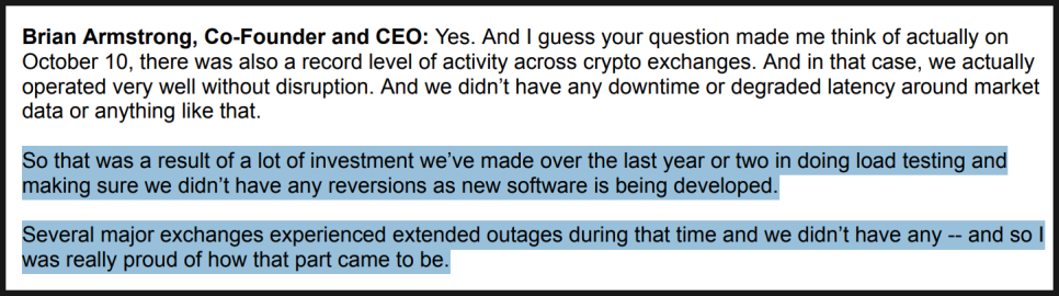 참고로 10월 10일 암호화폐 시장 급등락 시 AWS(아마존 웹 서비스) 장애가 있었음에도, 코인베이스는 단 한 번의 지연이나 중단 없이 거래를 유지했는데, 최근 2년간 이어진 인프라 강화와 부하 테스트(load testing) 투자의 결과라고 회사 측은 밝혔습니다.