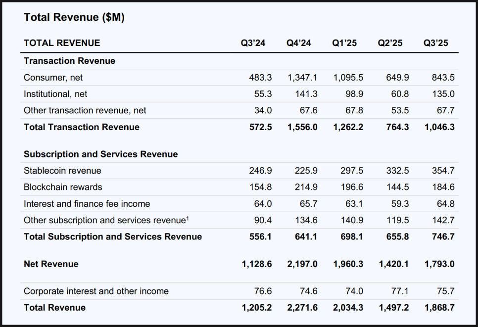 3분기 서비스 매출은 7억 4,700만 달러로 전분기 대비 14% 늘며 사상 최고치를 기록했습니다. 이 중 스테이블코인(Stablecoin) 관련 매출이 3억 5,500만 달러를 차지했습니다.