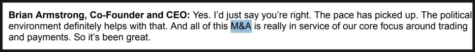 코인베이스 경영진은 “미국 내 정치·규제 환경이 명확해지면서 인수합병(M&A) 속도가 빨라지고 있다”고 밝혔습니다. 올해는 데리빗 외에도 자본시장 인프라 기업 에코(Echo)를 인수했는데요.