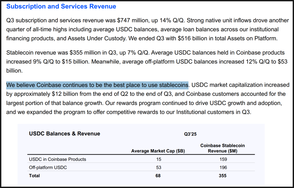 한편 암스트롱 CEO는 “향후 전 세계 결제의 대부분이 스테이블코인으로 전환될 것”이라고 강조했습니다. 코인베이스의 USDC(USD코인) 보유 고객 잔액은 평균 150억 달러로, USDC 전체 시가총액(740억 달러) 중 가장 큰 비중을 차지합니다.