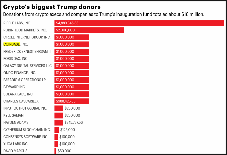 코인베이스는 2024년 대선 전후로 트럼프 캠프에 가장 많은 기부를 한 암호화폐 기업 중 하나인데, 현재 미국 정부가 친암호화폐 기조를 가져가도록 계속해서 푸시를 하고 있는 것으로 보입니다.