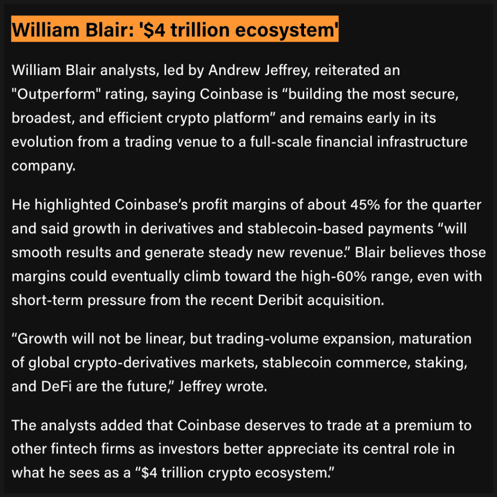 한편 윌리엄 블레어는 “코인베이스는 단순히 거래 플랫폼을 운영하는 기업이 아니라, 4조 달러 규모의 암호화폐 생태계를 설계하는 인프라 기업으로 성장하고 있다”고 평했습니다. 코인베이스의 목표가 금융 시스템 전반을 온체인(on-chain)화하여 누구나 토큰 형태로 가치 교환을 할 수 있는 세상을 여는 것이라는 건데요. 암스트롱 CEO의 말처럼, 과거의 아마존이 물류와 클라우드로 세상을 바꿨다면, 코인베이스는 금융 인프라를 블록체인 위로 옮기고 있는 거죠.