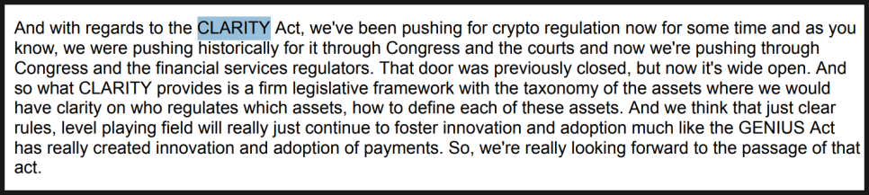 한편 코인베이스는 미국의 CLARITY 법안(암호자산 규제 명확화 법안) 통과를 강력히 지지하고 있습니다. 이 법안은 암호화폐 자산의 분류 기준과 감독 기관의 역할을 명확히 하여 산업의 제도화를 촉진하는 내용입니다.