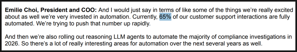실제로 코인베이스는 운영 효율화에도 적극적으로 투자하고 있습니다. 현재 고객 응대의 약 65%를 완전 자동화했으며, 2026년까지는 규제 준수(Compliance) 조사 업무의 상당 부분을 AI 에이전트가 처리할 수 있도록 시스템을 개발 중입니다.