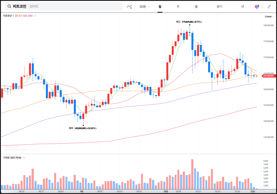 이후 10월 초에는 매수세가 집중되며 단기 급등이 이어졌습니다. 10월 중순에는 1억 7980만 원까지 치솟아 약 두 달 만에 20% 가까이 상승했죠. 그러나 이 시점을 정점으로 하락 전환이 시작되었습니다.