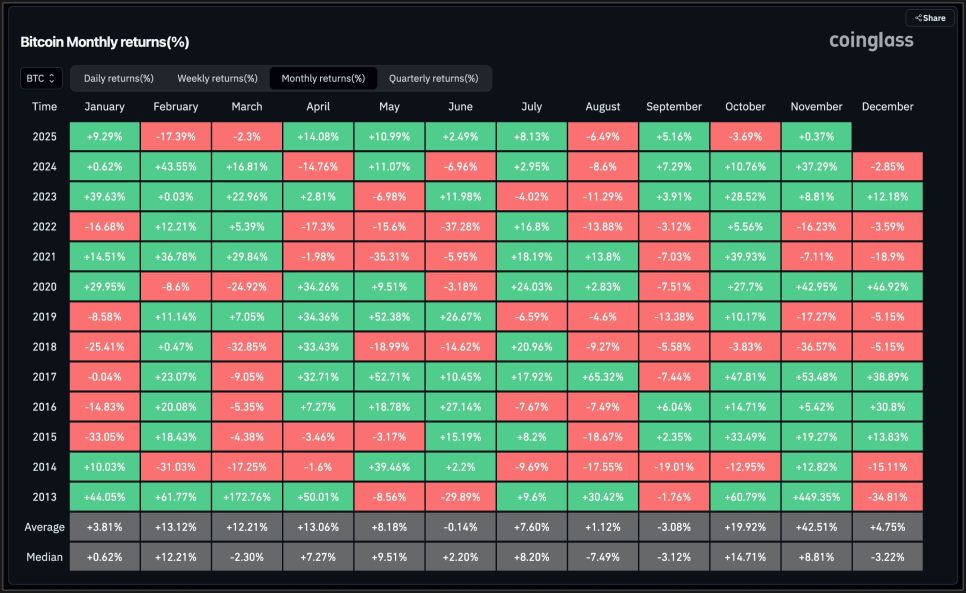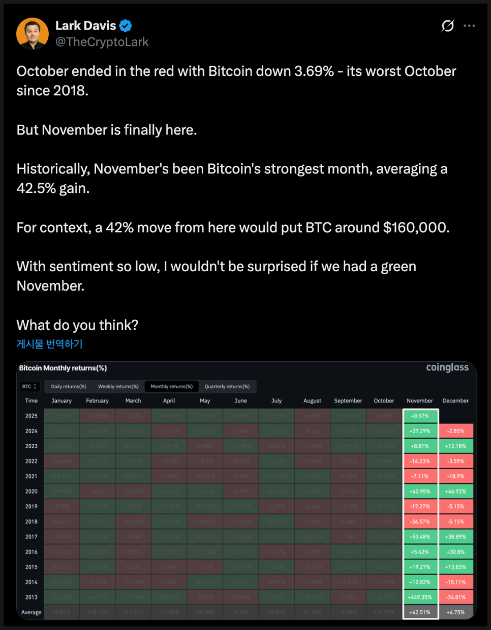 크립토 애널리스트 라크 데이비스(Lark Davis)처럼 “11월은 비트코인의 평균 상승률이 42%로 가장 강한 달”이라고 말하는 사람들도 있지만, 사실 이 수치에는 함정이 있습니다. 바로 2013년 11월의 폭등 때문이죠. 그 해 한 달 동안 비트코인이 449%나 올랐거든요. 이 한 번의 이례적인 상승이 평균치를 왜곡한 겁니다.