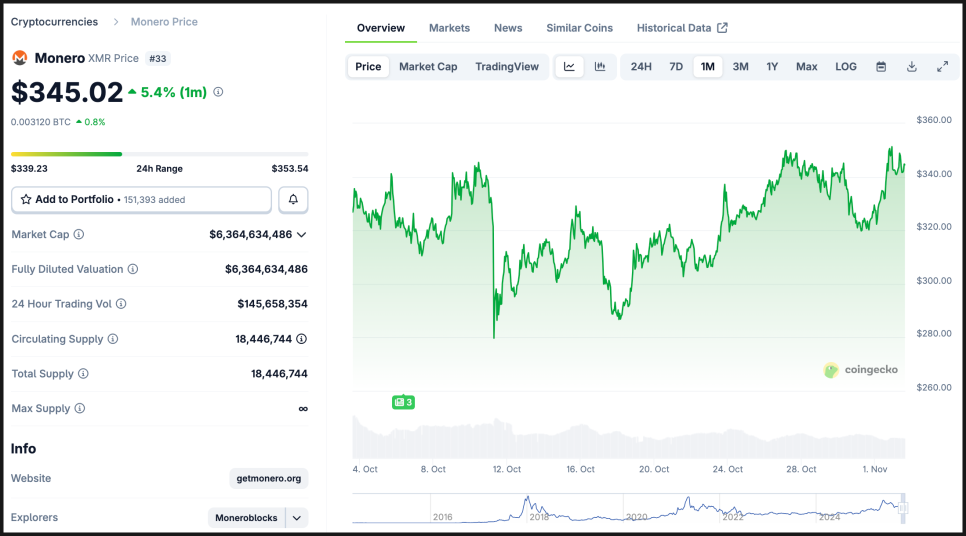 소형 알트코인 중에서도 한 달 동안 5% 이상 상승한 모네로(Monero)와