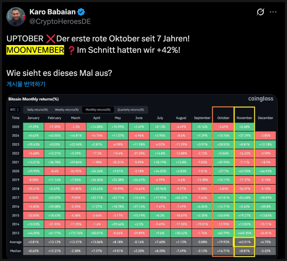 중간값(메디안)을 보면 실제로는 약 9% 상승에 불과합니다. 즉, 11월이 강세를 보일 가능성이 높은 건 맞지만, 보장된 건 아닙니다. 오히려 변동성이 크다는 뜻에 가깝죠. 결국 ‘문벰버’는 코인 투자자들의 희망 섞인 바람일 뿐, 확실한 예측 도구는 아닙니다. 역사적 맥락으로 참고할 수는 있지만, 매매의 근거로 삼기엔 위험하죠.