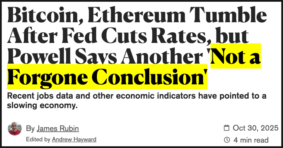 지난 10월 말 수요일, 파월 의장은 기자회견에서 “금리 인하는 ‘당연한 결론(foregone conclusion)’이 아니다”라고 단언했습니다. 이 한 문장은 시장에 즉각적인 파장을 불러왔습니다. 불과 몇 분 만에 비트코인을 비롯한 주요 디지털 자산이 급락했고, 시가총액 기준 최대 암호화폐인 비트코인은 한때 10만 6천 달러 아래로 미끄러졌습니다.