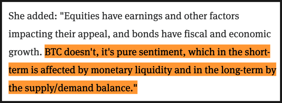 그녀의 설명을 풀어보면 이렇습니다. 주식은 기업 실적(earnings)이라는 ‘내재 가치’가 있고, 채권은 금리와 경제성장률(fiscal and economic growth)에 의해 가격이 결정됩니다. 그러나 비트코인은 그런 요소가 없습니다. 본질적으로 “심리(social sentiment)”와 “유동성(monetary liquidity)”이 가격을 좌우하는 자산이라는 겁니다.