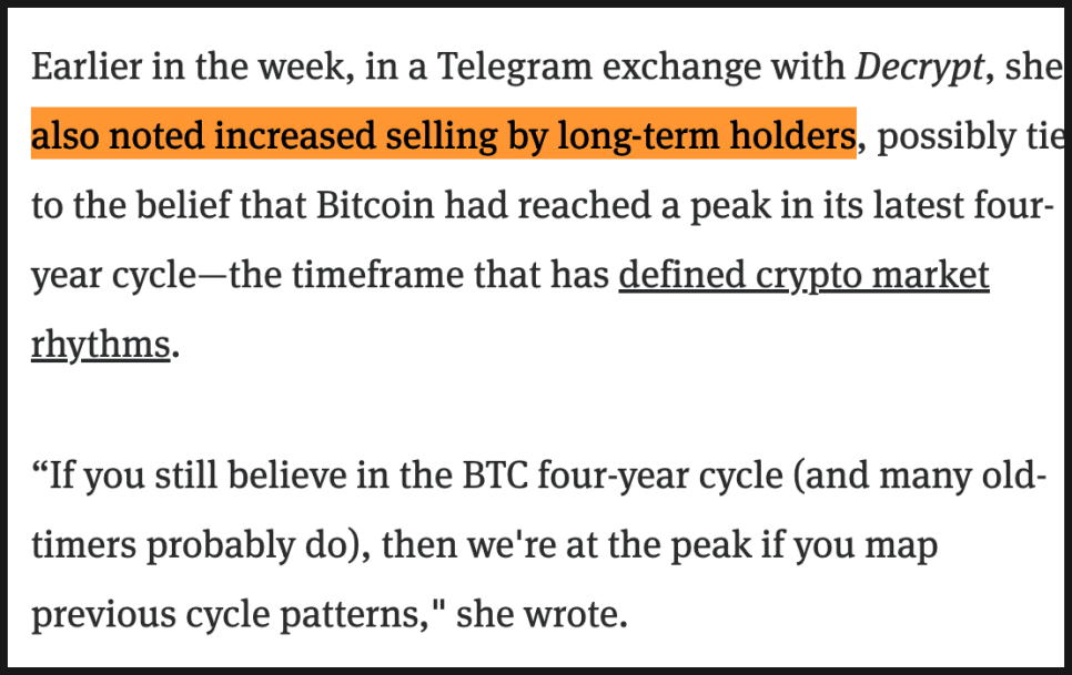 애치슨은 또 다른 흥미로운 분석을 덧붙였습니다. 그녀는 같은 주 디크립트와의 텔레그램 대화에서 “장기 보유자(long-term holders)의 매도가 눈에 띄게 늘었다”고 말했는데, 이는 많은 투자자들이 비트코인이 ‘이번 4년 주기의 정점(four-year cycle peak)’에 도달했다고 믿기 시작했기 때문이라고 설명했습니다.