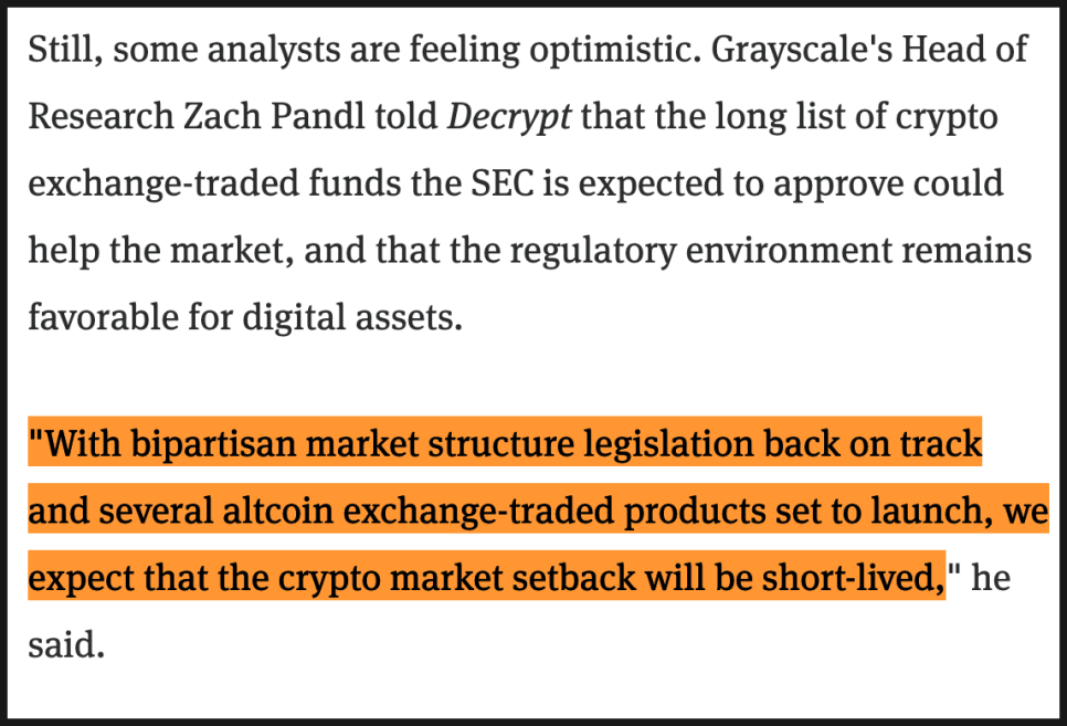 그럼에도 불구하고, 모든 전문가가 비관적인 것은 아닙니다. 그레이스케일(Grayscale)의 리서치 책임자 잭 팬들(Zach Pandl)은 “미국 증권거래위원회(SEC)가 다수의 암호화폐 ETF 승인을 앞두고 있고, 시장 구조 관련 법안이 초당적 합의로 다시 추진되고 있다”며 “이번 조정은 단기적인 조정일 가능성이 높다”고 전망했습니다.