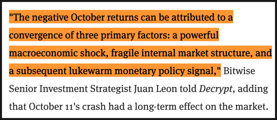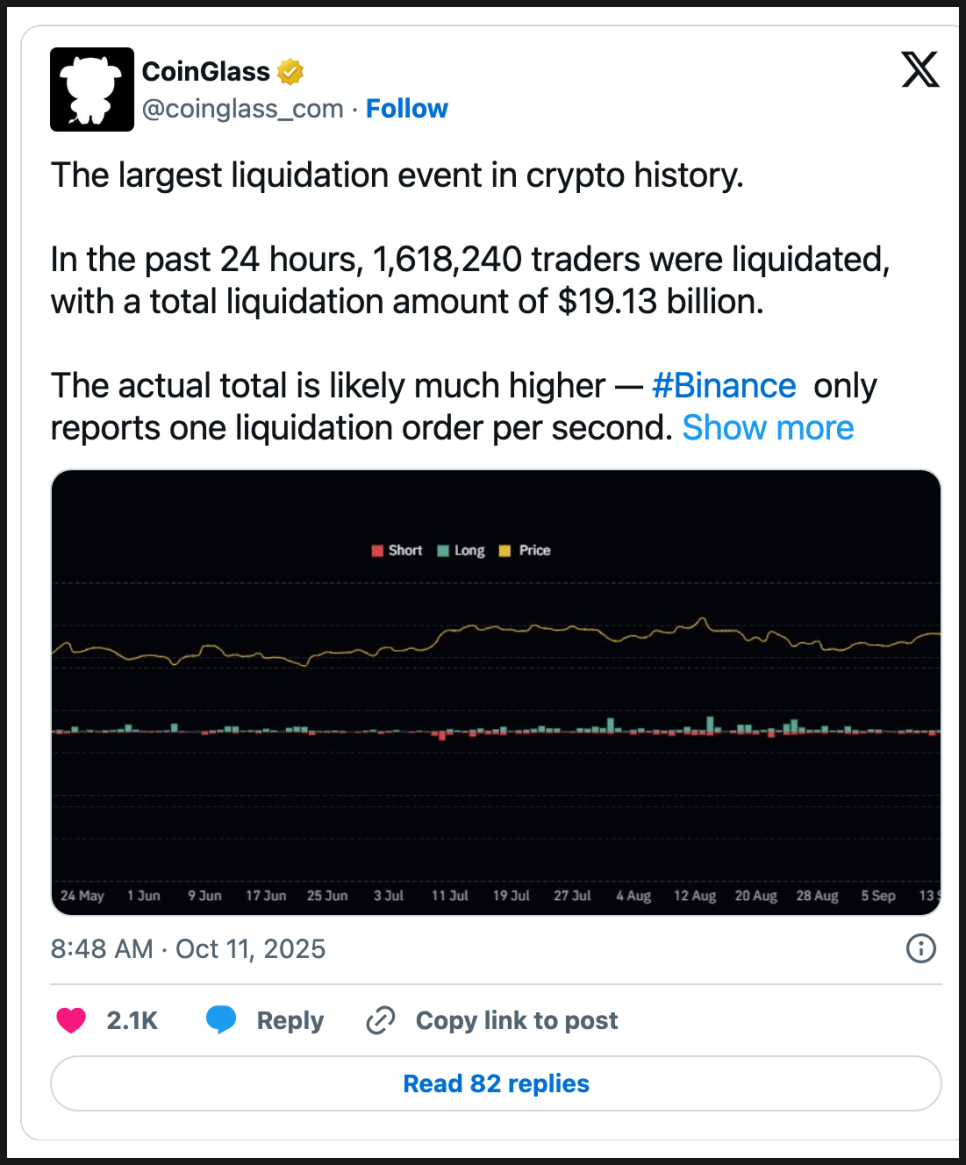 10월 10일부터 11일까지의 이틀은 올해 가장 극적인 매도세가 몰린 시기였습니다. 파생상품 거래소에서는 가격이 급락하자 자동 청산(auto-liquidation)이 연쇄적으로 발생했습니다.