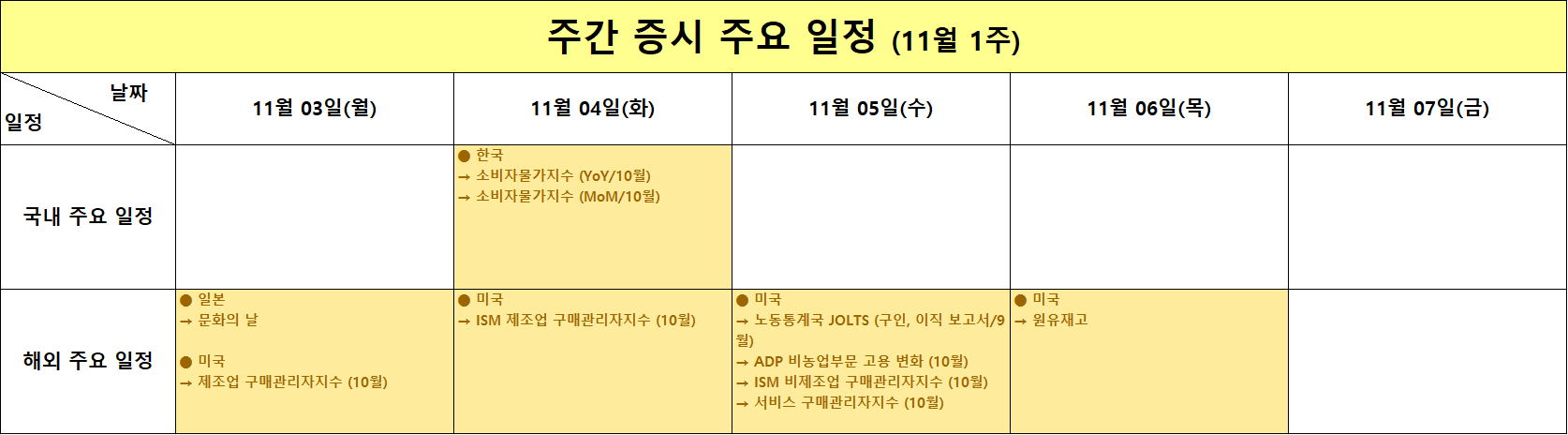 이번 주 시장의 핵심 변수는 11월 4일 발표될 한국의 소비자물가지수(CPI)와 11월 5일 예정된 미국의 고용 관련 지표들입니다. 한국의 물가 지표는 연말 금리 정책의 방향성을 가늠하는 데 중요한 자료가 될 것으로 보이며 미국에서는 JOLTS 구인 보고서, ADP 비농업부문 고용, ISM 비제조업 지수 등 고용과 경기 체력을 동시에 반영하는 지표들이 발표됩니다. 만약 고용 둔화세가 확인된다면 ‘연준의 동결 혹은 조기 인하’ 기대가 더욱 커질 가능성이 있습니다.