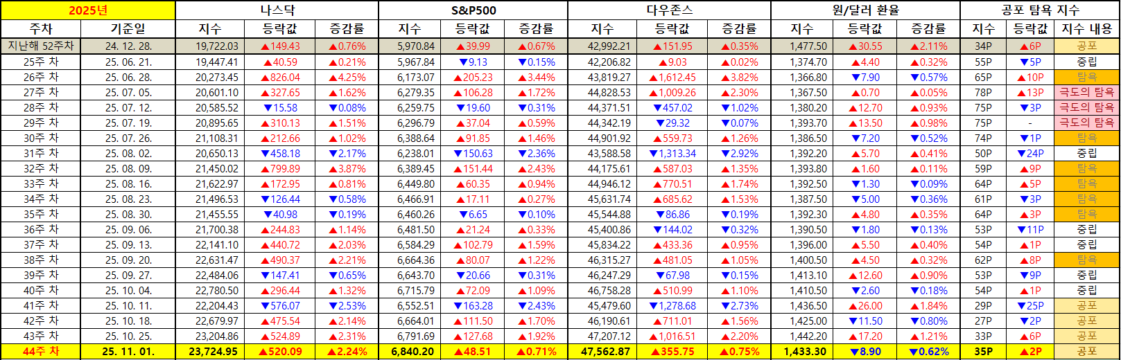 환율 역시 완만한 하락세를 이어가며 안정감을 주었습니다. 원·달러 환율은 전주 대비 8.9원 내린 1,433.3원을 기록했으며 이는 외국인 자금 유입에 긍정적으로 작용했습니다. 탐욕·공포지수는 35포인트로 지난주 33포인트 대비 소폭 상승했는데 이는 여전히 ‘중립’ 수준으로 과열 구간은 아니라는 의미입니다.
