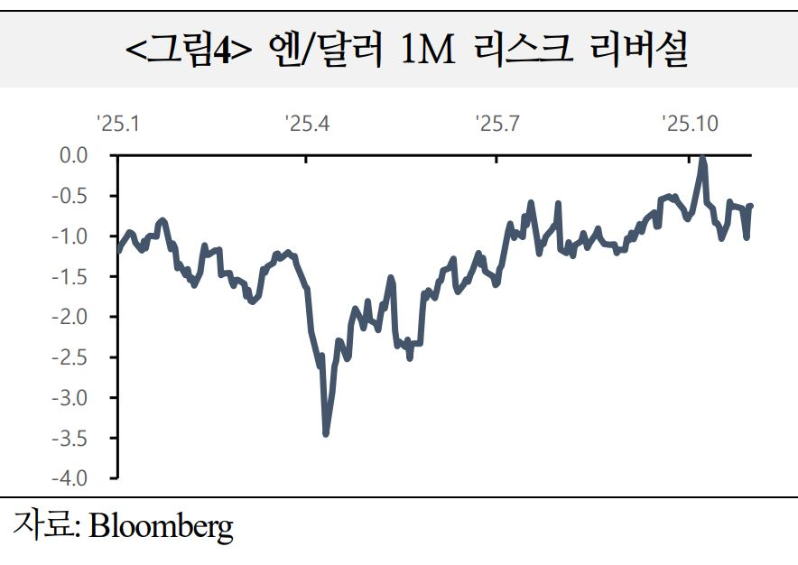 - 엔/달러 리스크 리버설*도 상승한 점에서, 글로벌 통화옵션 투자자들이 엔화 약세에 대한 기대가 증가하고 있음을 시사