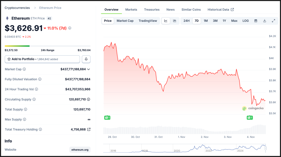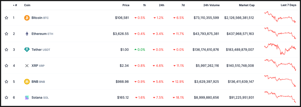 이더리움(ETH)은 약 7% 하락해 3,580달러 선을 기록했고,