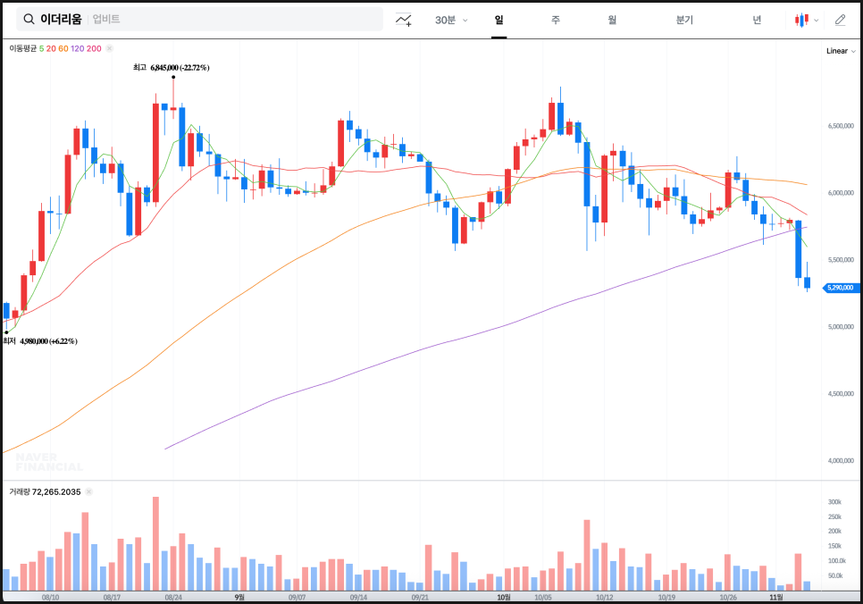 이 구간에서 5,000,000원을 지켜내면 반등 가능성이 남아 있지만, 그 아래로 떨어질 경우 4,500,000원대까지 내려가며 더 깊은 조정이 올 수 있습니다.