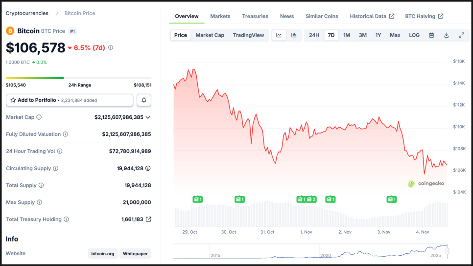 비트코인(BTC)은 하루 만에 약 4% 하락해 10월 중순 이후 최저 수준인 약 10만 5,700달러까지 떨어졌습니다.