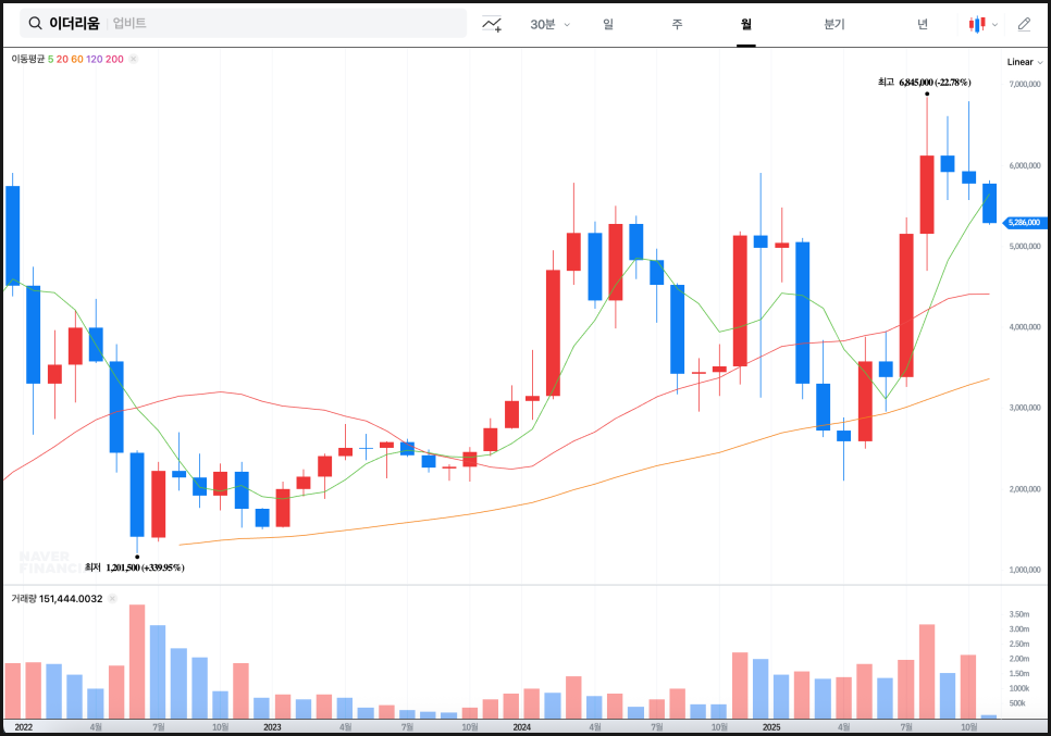 월봉 차트로 보면, 이더리움은 여전히 장기 상승 구조를 유지하고 있습니다. 2022년 최저점 1,201,500원에서 출발해 꾸준히 반등했고, 2024년 이후 강한 상승 추세로 이어졌습니다.