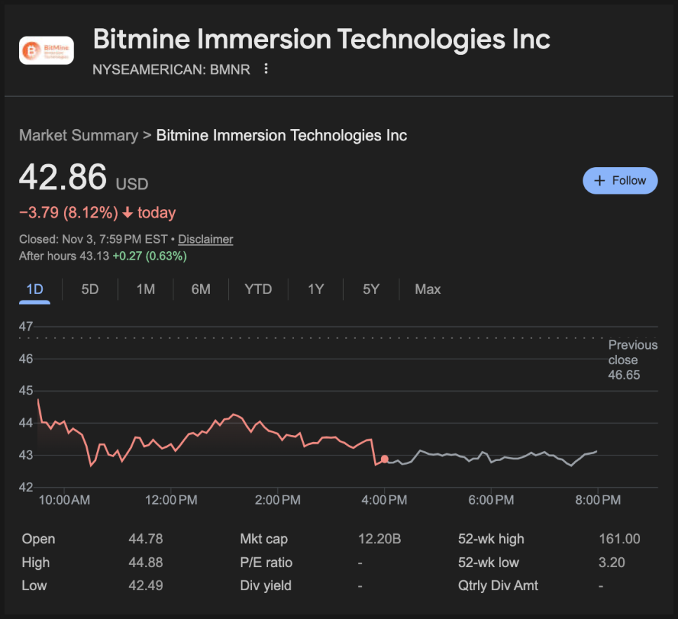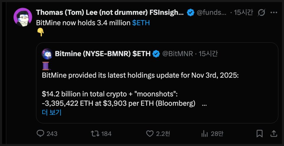 비트마인 이머전(BMNR) 주가가 하루만에 8% 하락했음에도 불구하고, 비트마인의 회장 톰 리(Tom Lee)는 여전히 낙관적입니다.