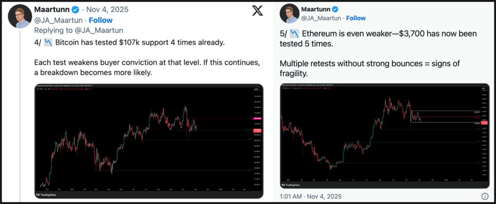 전문가들은 이번 급락이 여러 요인이 동시에 작용한 결과라고 분석했습니다. 암호화폐 분석 플랫폼 크립토퀀트(CryptoQuant)의 애널리스트 ‘마트운(Maartunn)’은 비트코인과 이더리움이 최근 반복적으로 ‘지지선(Support Level)’을 재시험하고 있다고 지적했습니다.